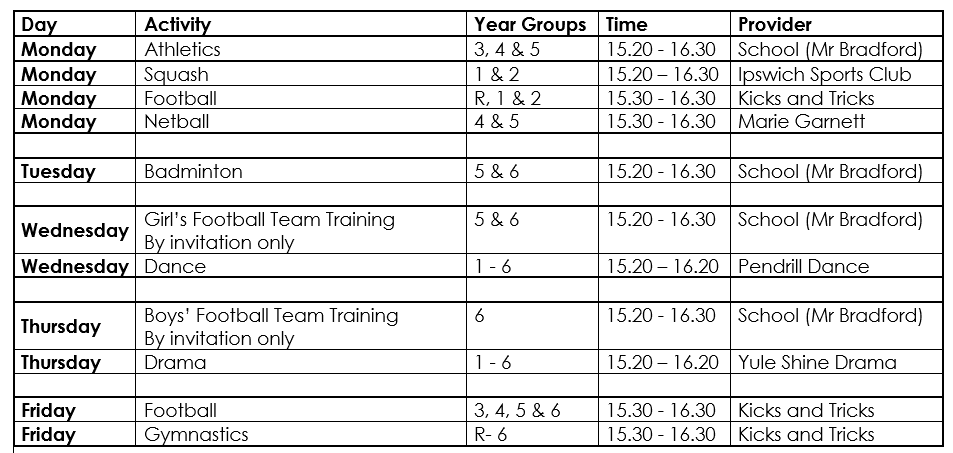 The clubs currently offered are listed below. Please note; these clubs are often in high demand and places are limited. Please contact the school for further information.